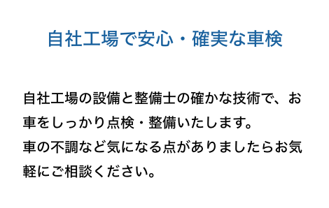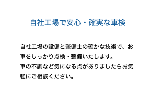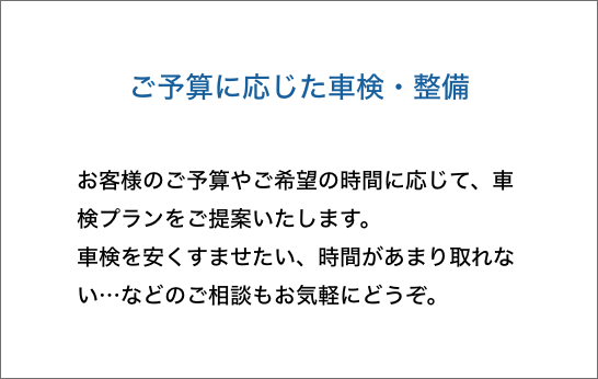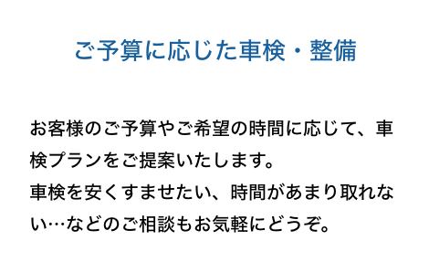 当社の車検は、三つの車検コースを基本に、軽自動車の車検、乗用車の車検、輸入車の車検、バントラックの車検、とお客様のご予算やご要望に対応しております。