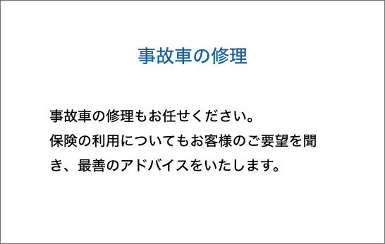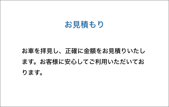 出張見積もりは可能ですか。 | 事故などで動かない車の出張見積もりは可能です。お客様のご家庭、仕事先、ご指定の場所まで見に伺い対応させていただきます。 |