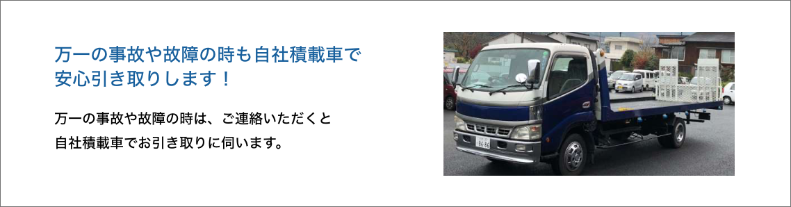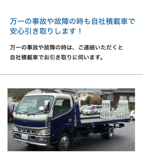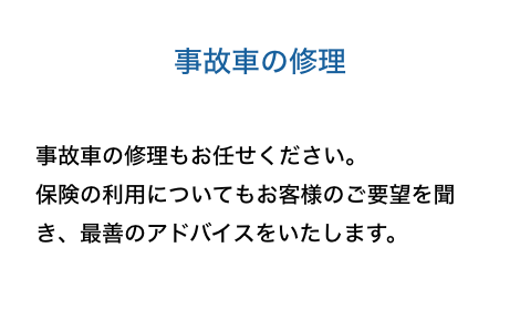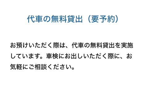修理期間はどれくらいかかりますか。 | 修理の期間は、故障状況、部品の入庫状況等によって一概にいえませんが、お問合わせ頂いたときに大体の修理日数と納車日をお伝えさせていただきます。また、その期日を超える場合は、できる限り早めにご連絡させていただきます。修理期間中の代車は無料です。 |