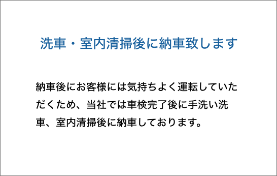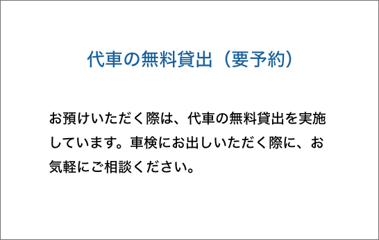 | 修理期間はどれくらいかかりますか。 | 修理の期間は、故障状況、部品の入庫状況等によって一概にいえませんが、お問合わせ頂いたときに大体の修理日数と納車日をお伝えさせていただきます。また、その期日を超える場合は、できる限り早めにご連絡させていただきます。修理期間中の代車は無料です。 |
