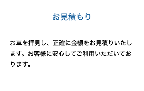 | 出張見積もりは可能ですか。 | 事故などで動かない車の出張見積もりは可能です。お客様のご家庭、仕事先、ご指定の場所まで見に伺い対応させていただきます。 |